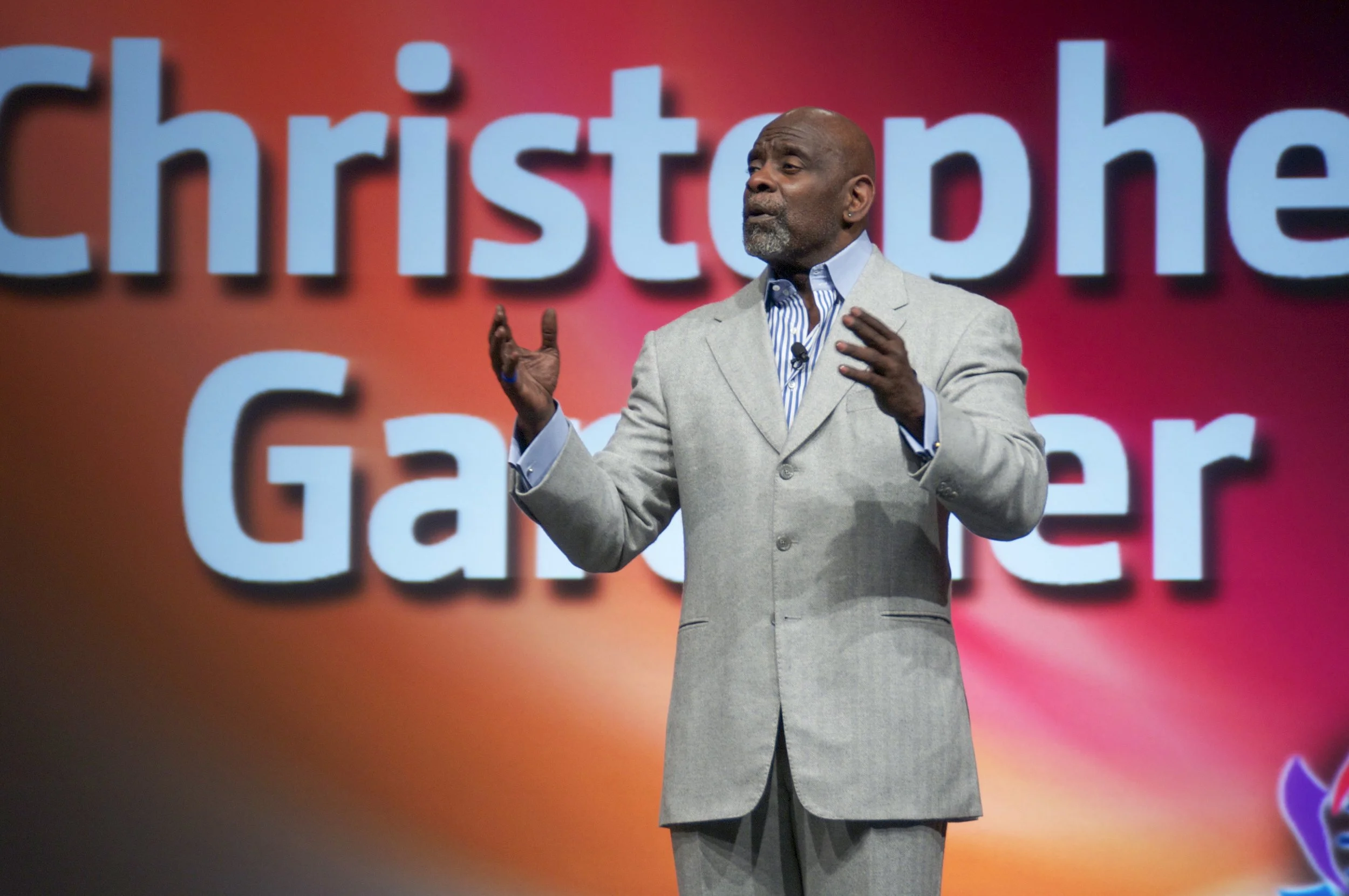 Christopher Gardner, keynote speaker and author of "The Pursuit of Happyness" takes the stage.